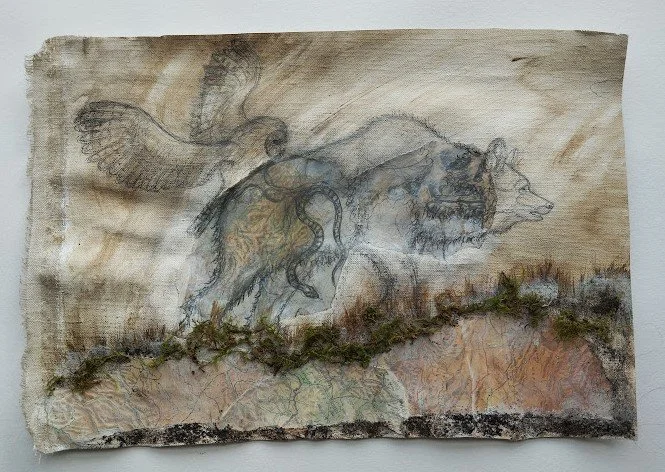 Mythos V, 2024, 29,5 x 33,5 cm, potlood, bister, aarde, mos, collage op katoen
